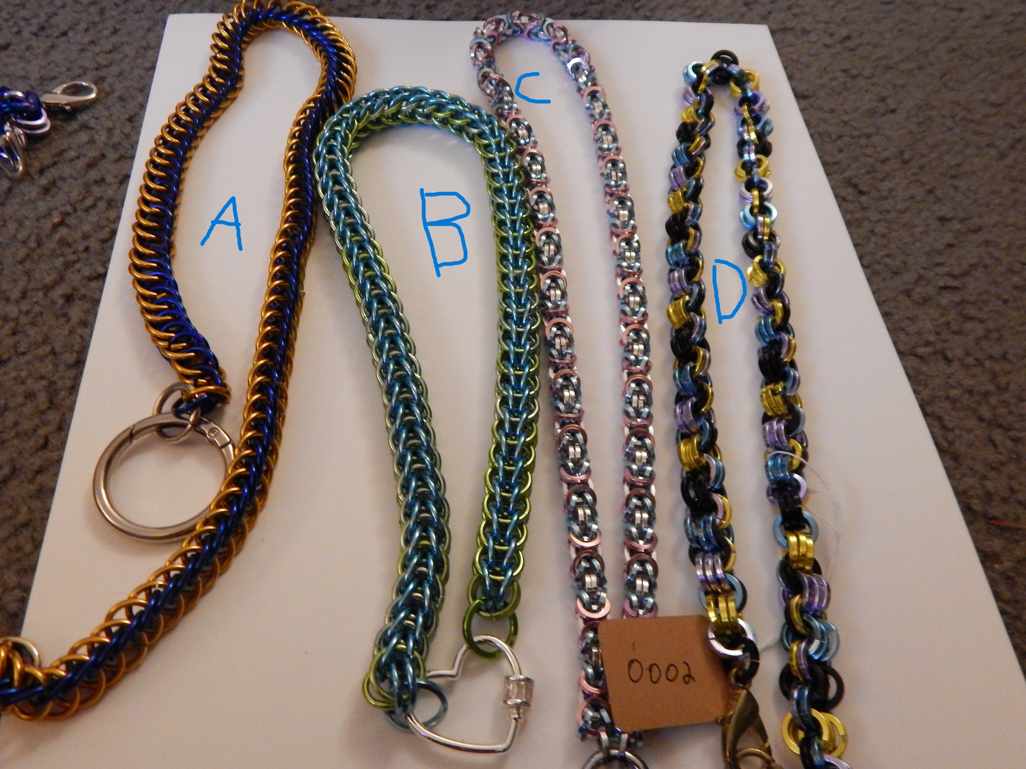these collars and necklaces come in specified variants in the photo. they come in any colour combo or solid colour and are made up of anodized aluminum rings.